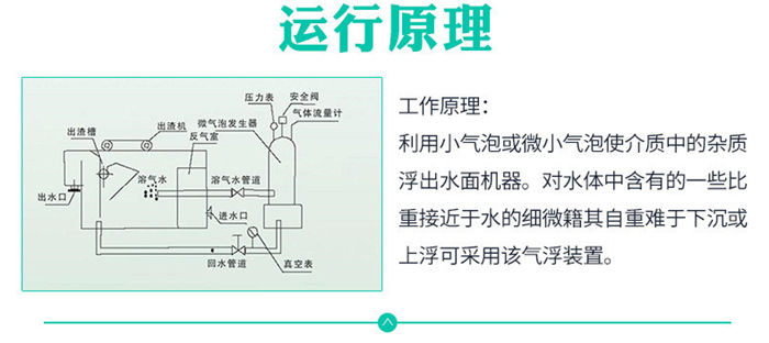 污水經(jīng)絮凝反應(yīng)后進入混合區(qū),與溶氣水混合接觸。絮體與溶氣水中的小氣泡相互粘合,然后進入氣浮區(qū),并隨小氣泡一同浮到水面,形成浮渣。下層的清水經(jīng)集水器流至清水池后,一部分回流作溶氣水,剩余清水通過溢流口流出。氣浮池上面的浮渣由刮板刮至污泥池并排出。