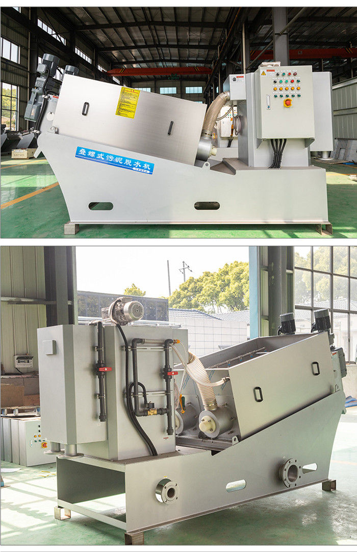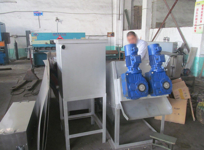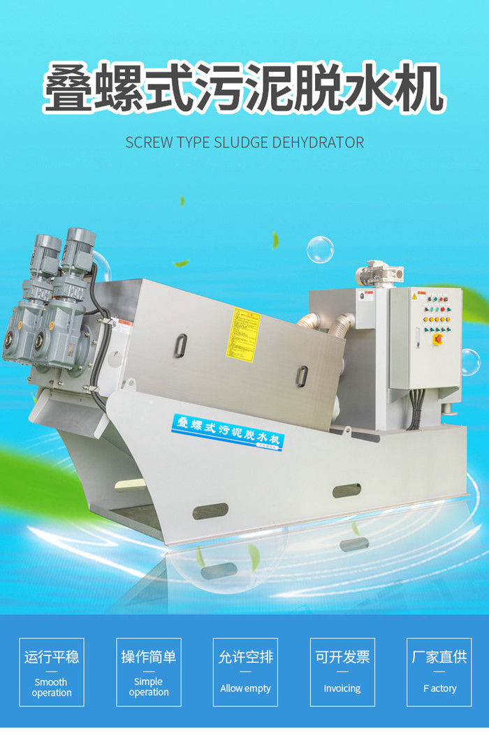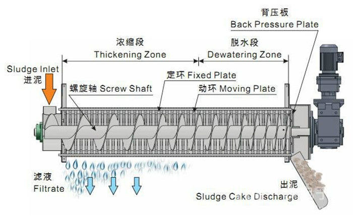 污泥通過泵,輸送至污泥槽,流至混合槽內(nèi),同時絮凝劑由加藥泵送至槽內(nèi),混合槽由液位控制,防止?jié)M溢。攪拌混合形成泛花,理想泛花象棉花狀,一朵朵的,然后流至過濾機(jī),液體透過動片與定片的間隙流出,固體通過螺旋旋轉(zhuǎn)不斷向前,在出口壓板的作用下充分脫水,至出口。